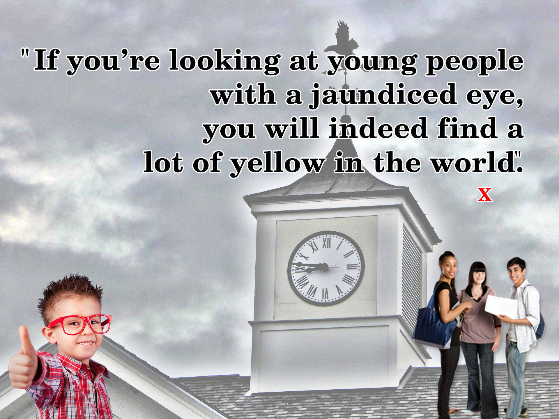 This ongoing harsh attitude toward an entire generation of youth only serves to further a cliché which has no basis in reality. Kids today aren’t less motivated, less intelligent or more spoiled than they ever have been. No, I’m sorry. It is us who are filtering our world to perpetuate a tired myth of insolence. The Talmud says, “We do not see things as they as we, we seem them as we are.” If you’re looking at young people with a jaundiced eye, you will indeed find a lot of yellow in the world.