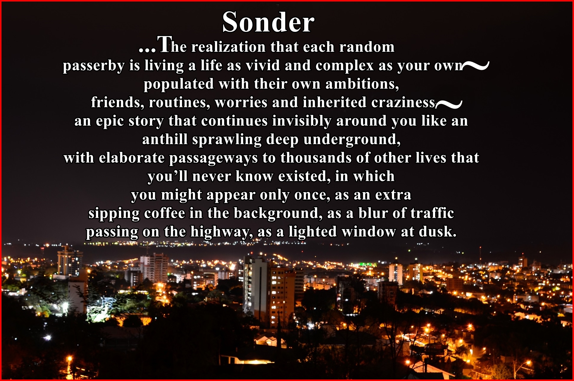 Sometimes I would characterize the fleeting thought of sonder as a distant relative of loneliness, although it would be more accurate to say its more akin to separateness. Not just of me from “you,” but also a separation of my own focus from what could be. Our lives basically force us into a superficial attitude toward most other people – and we lose that tenuous spiraling ability to recognize the potential.