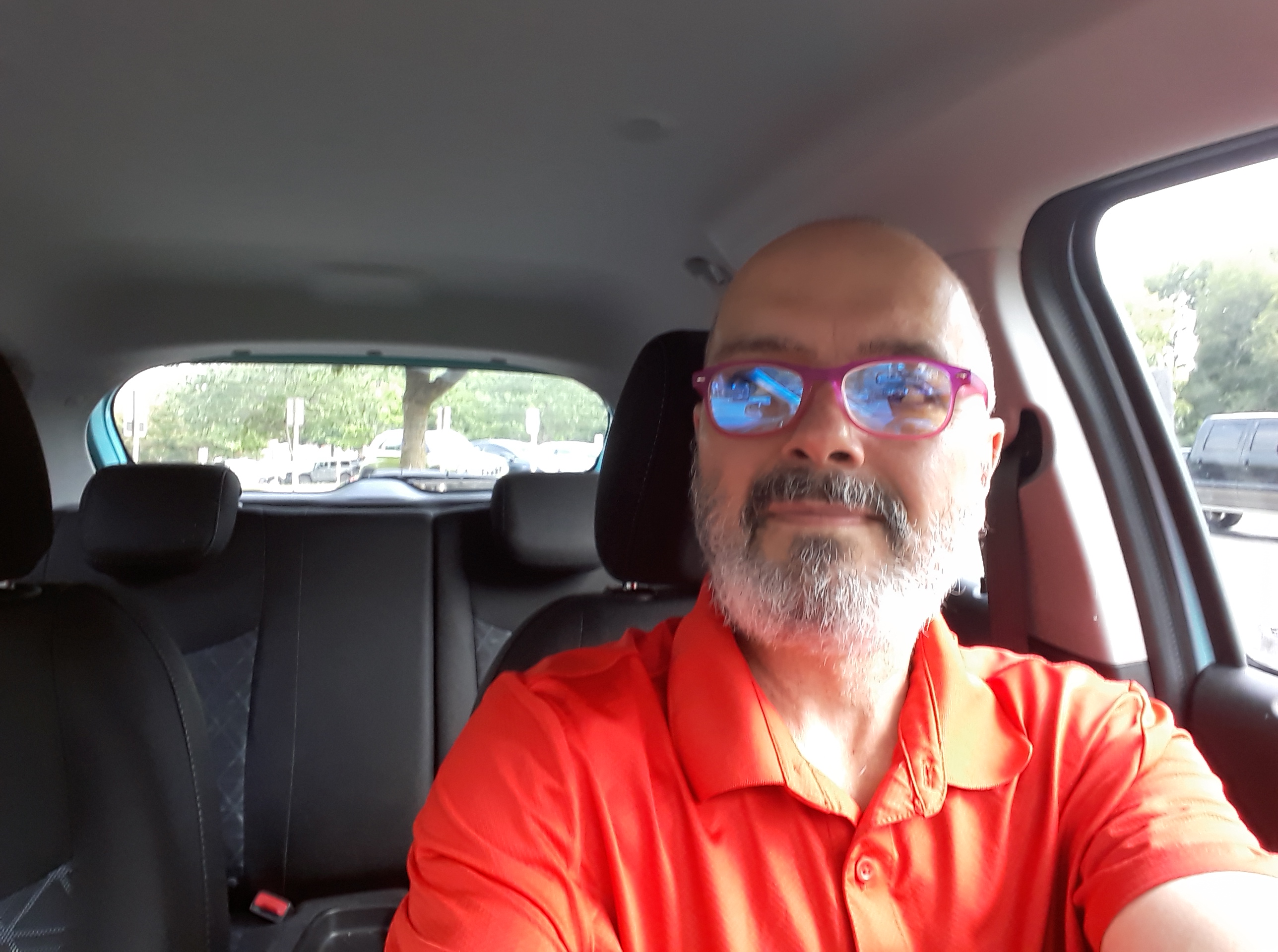 I look at my blue box fan, red rocking chair, spa blue Keurig, cotton candy car, my orange-red shirt, and the metal works I spray-painted…