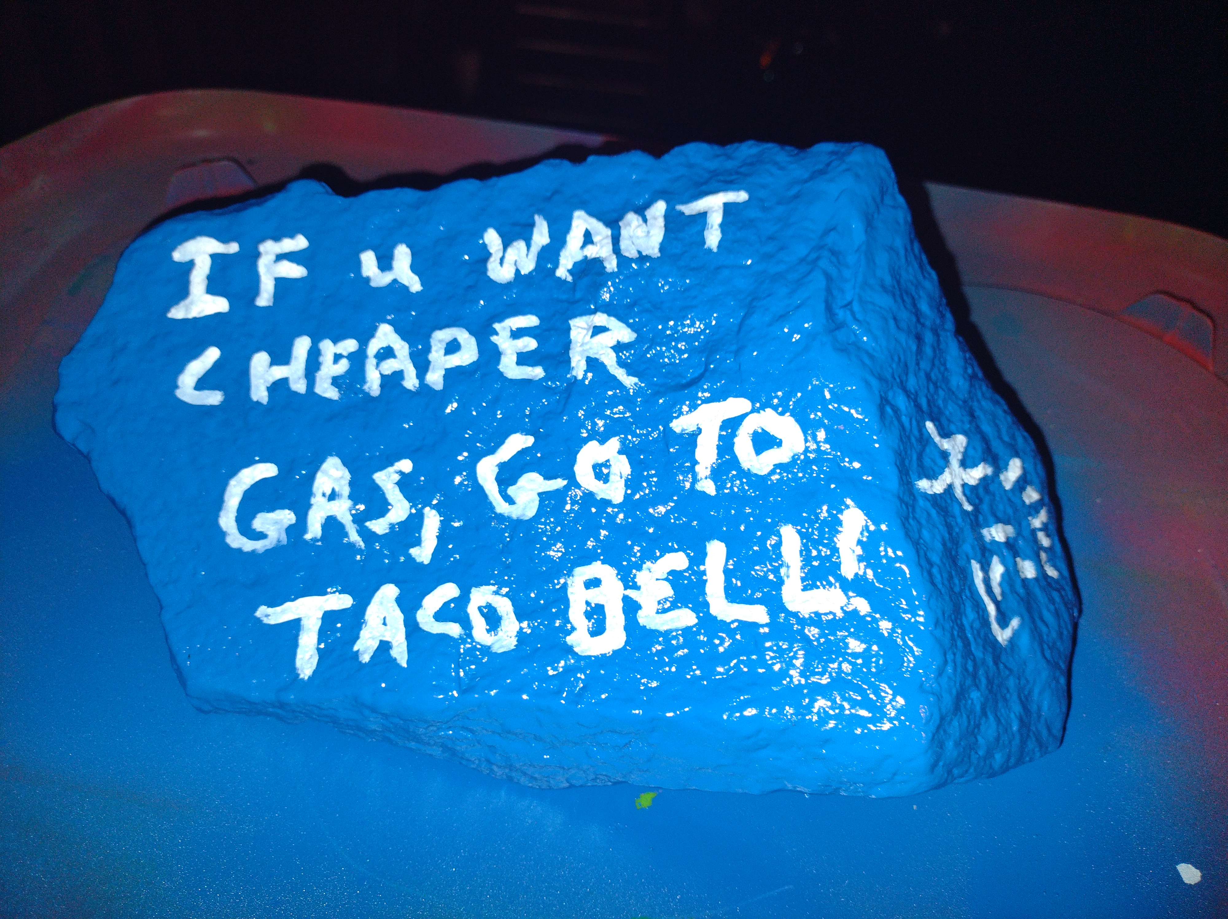 My latest painted rock. Would it be funny to conspicuously place this at the local convenience store gas pumps?