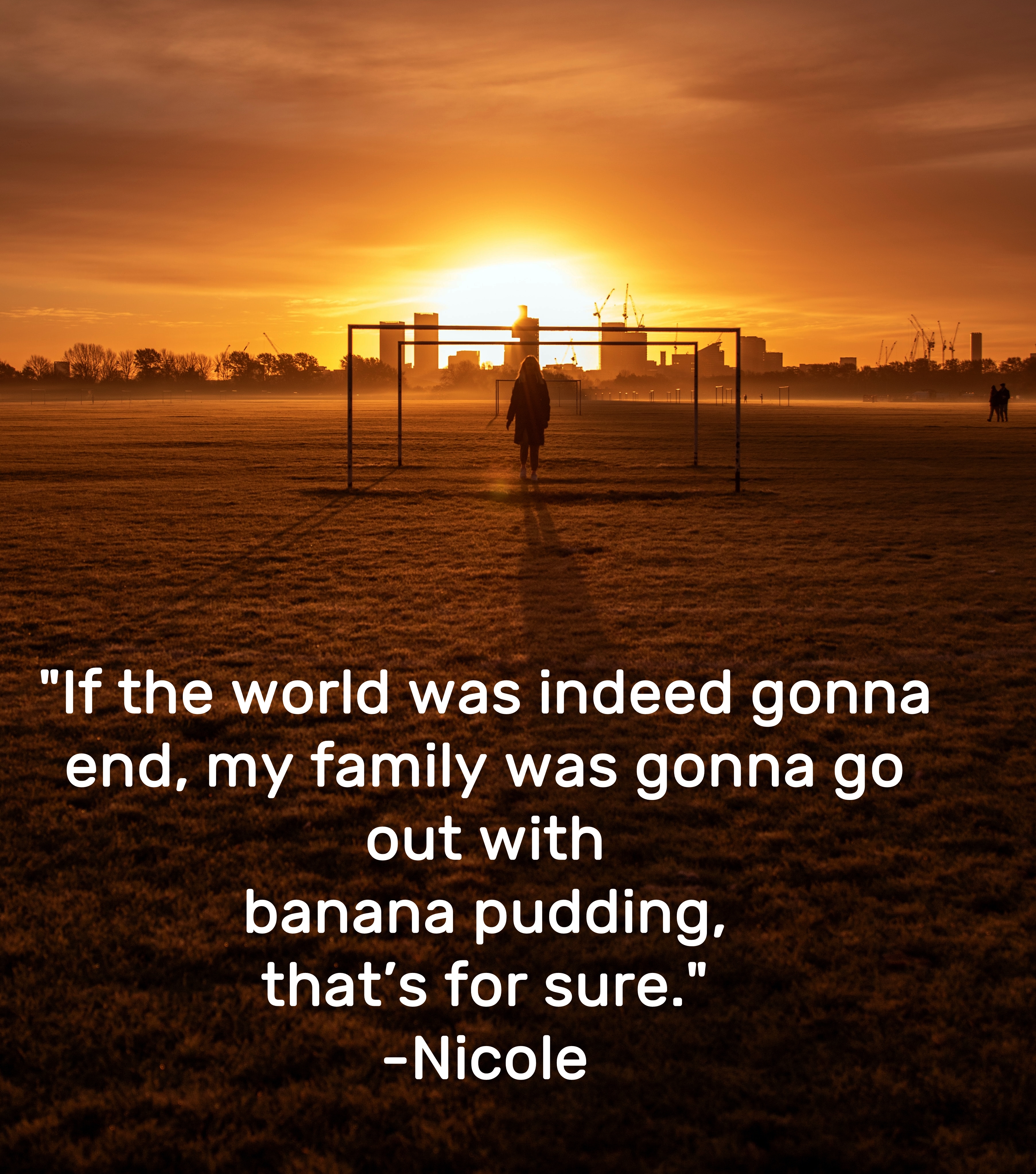 Also: Just before reading Nicole’s words on FB, I was toying with the idea of making banana pudding. Now in our fridge is a fresh batch, made just before (unexpectedly) seeing her quote again!