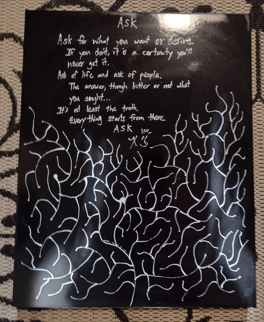 In the same way, I’ve diligently said, “I don’t know” with much greater frequency this year, I’ve also started asking. It’s a tangent to my propensity to state my truth without trying to wrangle someone into a specific reaction. It’s been a wild ride! Those who respond with incredulity that I ask are forgetting the fundamental truth: it’s never wrong to ask; it’s only wrong to respond irrationally on either side of the asking. It’s the cousin to honesty, a thing everyone claims to desire yet few embrace without grimace or discontent.