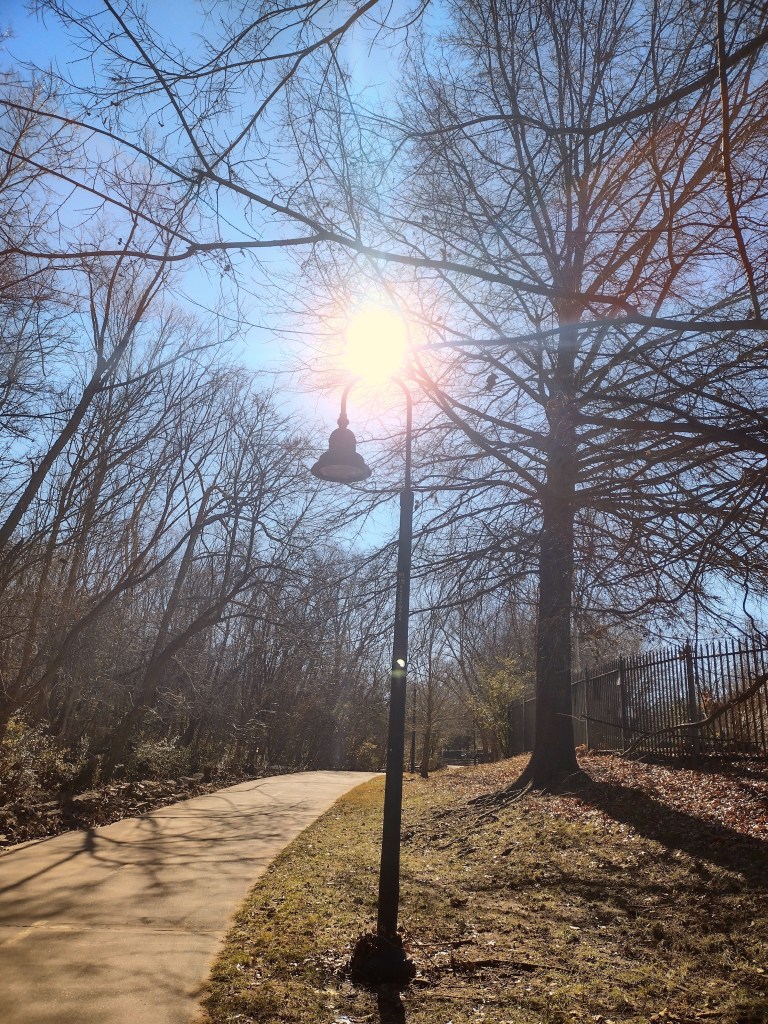 It is indeed just a lamp post. Above it, the December sun warms me. Whatever I’m experiencing is almost the opposite of mindfulness. I clocked out at work to walk down the hill to my car. Minutes later, I realized I was walking south on the trail. My feet must have vetoed my routine because I hadn’t even thought about the fact that I was briskly walking, listening to the creek adjacent to the trail, and lost in my thoughts. Before finishing work for the day, I had two disparate moments. The first was a surprise bit of irritation thrown upon me, an undeserved one, from someone responding to words of kindness and appreciation I had offered. Momentarily, my head filled with confusion and disappointment. The second moment was a laughter-filled conversation. When I realized I was walking on the trail, I looked up to see that lamp post illuminated by the bright sun. A congruent and companion light went off in my head. Which of the two disparate moments before leaving work do you think filled my heart? All moments can have meaning, especially if we are intuitive or paying attention. At the apex of my unintended walk, I sat on a ledge overlooking the creek below. The sun sits to the right above me warming my shoulders, even though the rest of me sits in shadows provided by a huge tree. The concrete blocks below me are cool and refreshing. The creek runs swiftly enough to babble its own language. Strangely, I feel like I know what it’s saying: flow, movement, and destination. All that kinetic energy around the low water bridge and walkway that traverses the creek. On one side, a tranquil pool that hides motion. On the other, a boisterous discharge of water trying to find its place. I know I will have to get up and walk back to my car. I think I will keep the sound of the creek in my head for a while and feel the warmth of the sun on my shoulders. I choose to remember the laughter and to forget the irritation. This walk was a stolen moment.