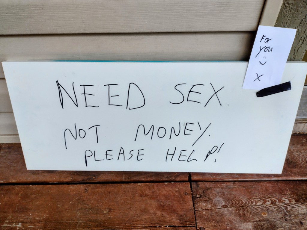 Just being a good neighbor! Since the original neighbor and his new roommate galavant around with no shirts on, they might as well up their game. I, of course, am here to help. Anyone who needs a really poorly made sign for this kind of purpose can reach out to me and I will hook you up. These neighbors did not ask for my help. I just see a need and compassionately reach out to offer my assistance. Ha! Please indemnify me from the consequences though. I have enough tomfoolery and shenanigans to fill my plate.