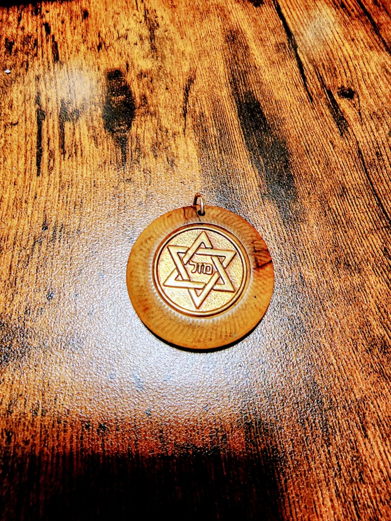 I reached in, and she put a round disk in my hand. I looked at it. It had, at one point, been on a necklace. On its face was a star of David and two Hebrew letters.