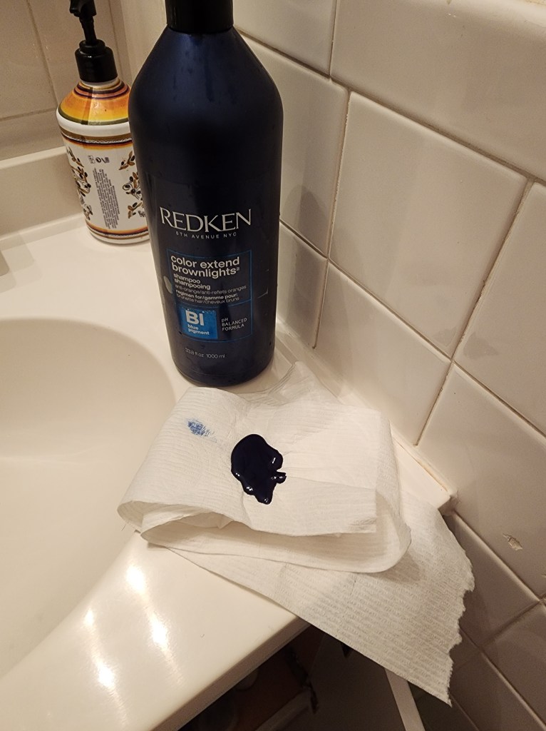 Erika was finishing in the other bathroom. I decided to shower too. Ever since the baby shark incident, she won’t let me shower with her. Often, I shower in the dark but left the light on this time – not that it helped to have it on this time. No soap. Okay, I will use body wash. None. Shampoo basically empty, But used what little I could get out, just enough to get my head and face soapy. No problem. I grabbed the dark bottle on top to finish. Squirted too much on me. Rubbed it all over me. Something seemed off. I rinsed my eyes as best I could. I was shocked to see I was covered in blue or black… something. Not only that, but I could see it apparently staining the tub and the shower curtain. One part of me wanted to holler for a Erika to come see the incredulous mess. The other part of me, my lizard brain, desperately tried to get whatever it was off of me and off of the shower and tub. This is a Airbnb after all. I’m not sure blackening the shower tub is covered under the deposit. My showers are routinely very fast. Not this time. I felt like I emptied Lake Michigan attempting to get the dark stain off of me and everything else. While I was still rinsing, Erika stepped in and I decided to tell her what I had done now that it looked like all the damage had been erased. Someone had left a bottle of Redken blue color enhancer on the top shelf of the shower. And a miraculous series of coincidences resulted in me using it as body wash.