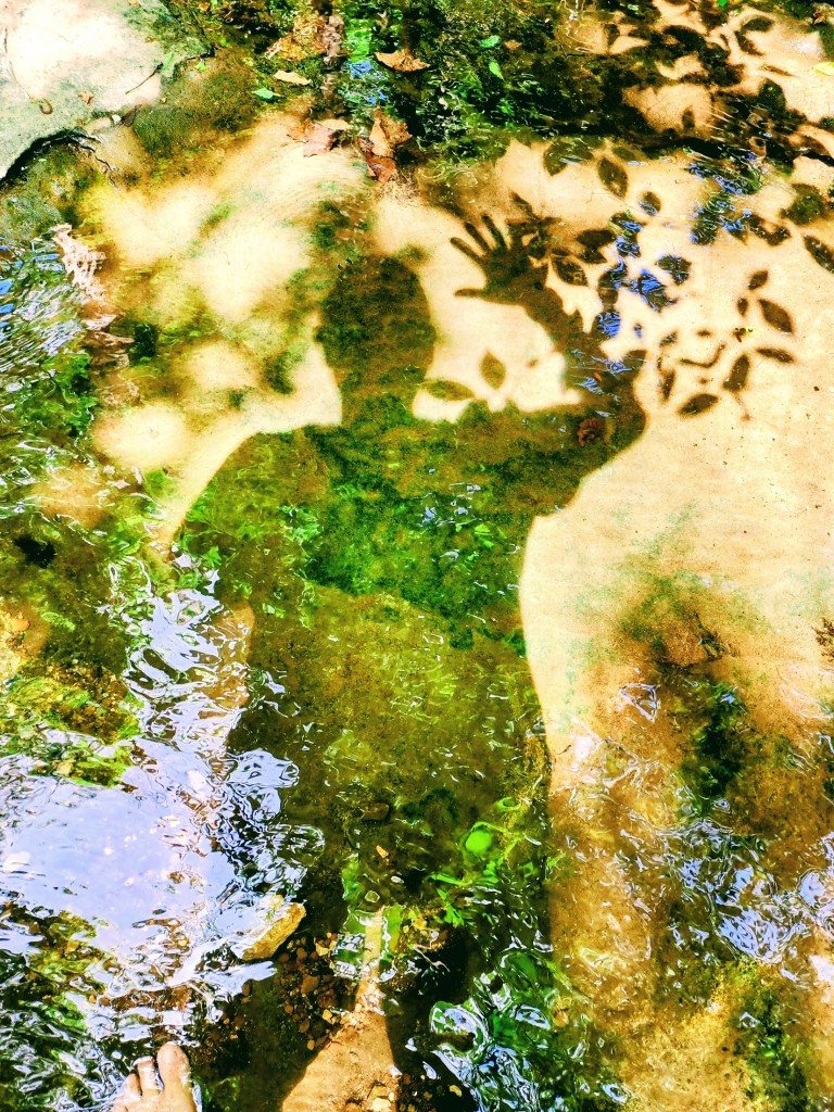 I left the apartment an hour early on the way to play taxi, my to-do list incomplete. The cold water of the creek was calling my name: “Jackass,” it whispered. The water was lower than I expected, but still cool enough and reaching my knees at one point. I walked down the middle of the creek to get a better view of the rock wall about 50 yards from the water bridge. As I traversed, the sun played hide and seek and changed the colors wildly. I found the water snake in its usual spot on the left side of the bank, coiled in a significantly deeper pool of water near a log. When I snapped the picture of my shadow in a shallow point in the water, I noted the prismatic effect the sun had on the water. The picture doesn’t do it justice. It looked like the sun and the shadows made a tacit agreement to render what I was experiencing in my head. I watched the dancing green and blue until it faded. I finished by giving the tiny minnows the opportunity to nip at my feet on the other side of the water bridge. My to-do list will still be in the apartment upon my return. The snake will remain coiled until the shadows grow longer. And the birds will chirp and sing as countless passersby pass on the trail above. X