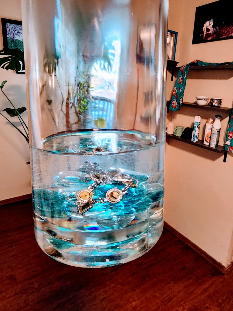 I also experimented with acrylic inside my light bottles. One was a complete failure. But in doing it wrong, the light bulb went off in my head. This one has a keepsake bracelet embedded in it.