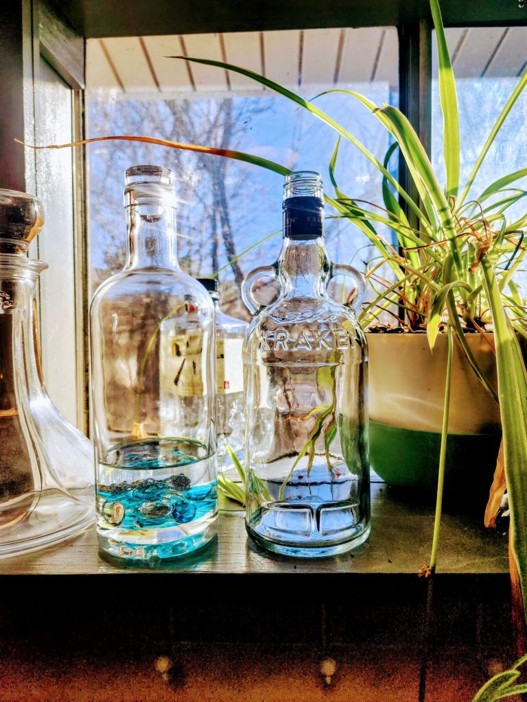 This afternoon, I walked behind a building and looked over the fence. The bottle I had left on their front porch weeks ago sat facing the sun, charging as much as possible in the low winter light so that it can later add color however the new owner sees fit.
