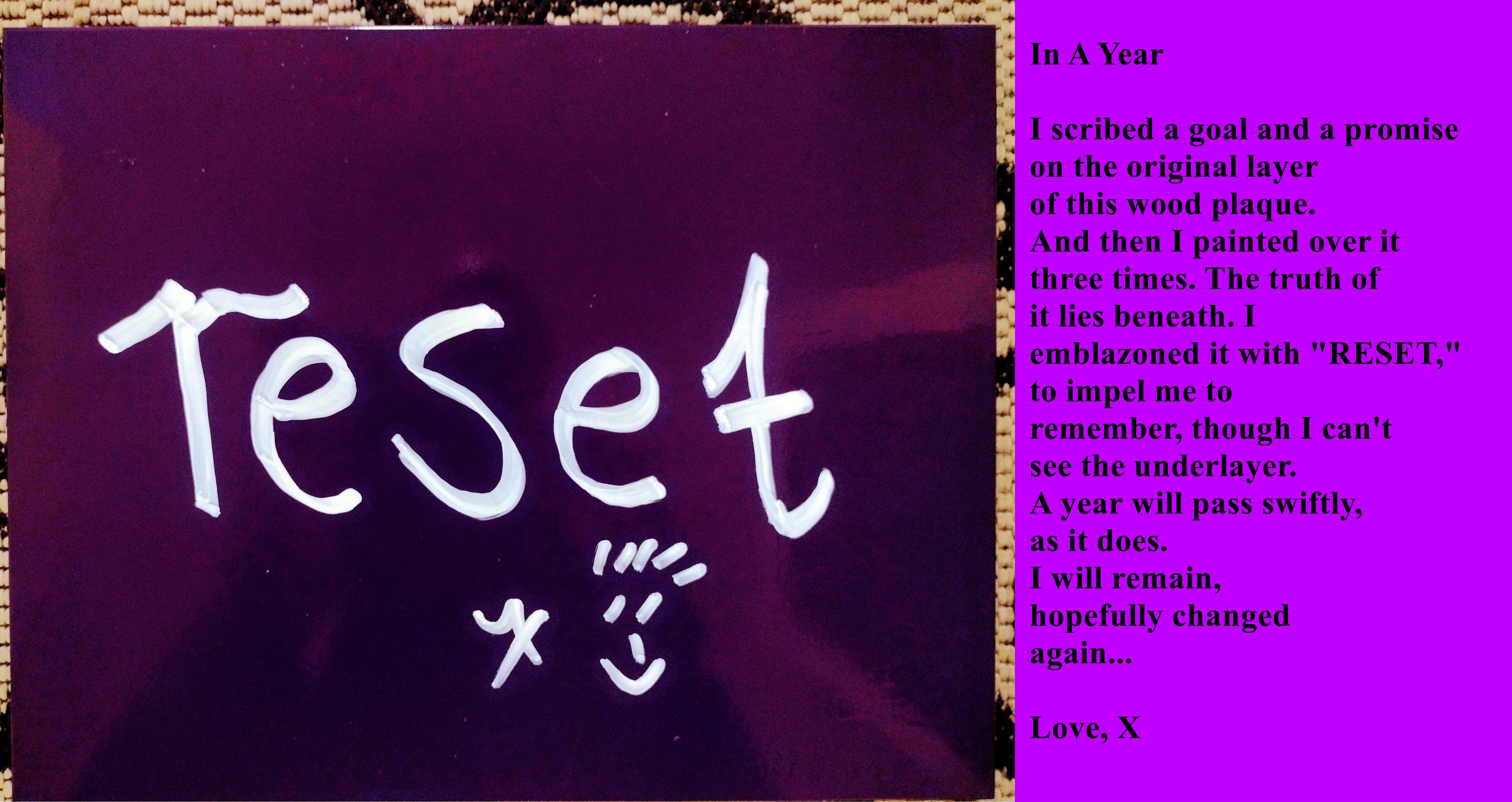 I scribed a goal and a promise on the original layer of this wood plaque. And then I painted over it three times. The truth of it lies beneath. I emblazoned it with “RESET,” to impel me to remember, though I can’t see the underlayer. A year will pass swiftly, as it does. I will remain, hopefully changed again…