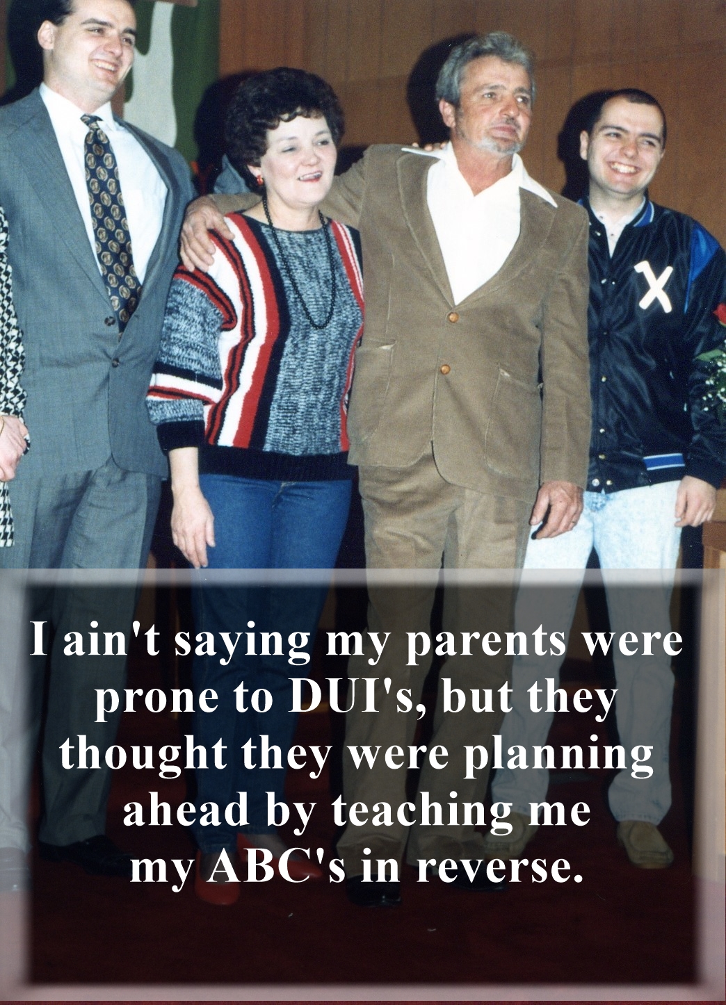 My parents really were experts at drinking and driving. But for this moment, no matter how terrible the road behind them, they were happy. Dad died nine months later. Mom was not charged. (That last sentence is supposed to make you laugh.)