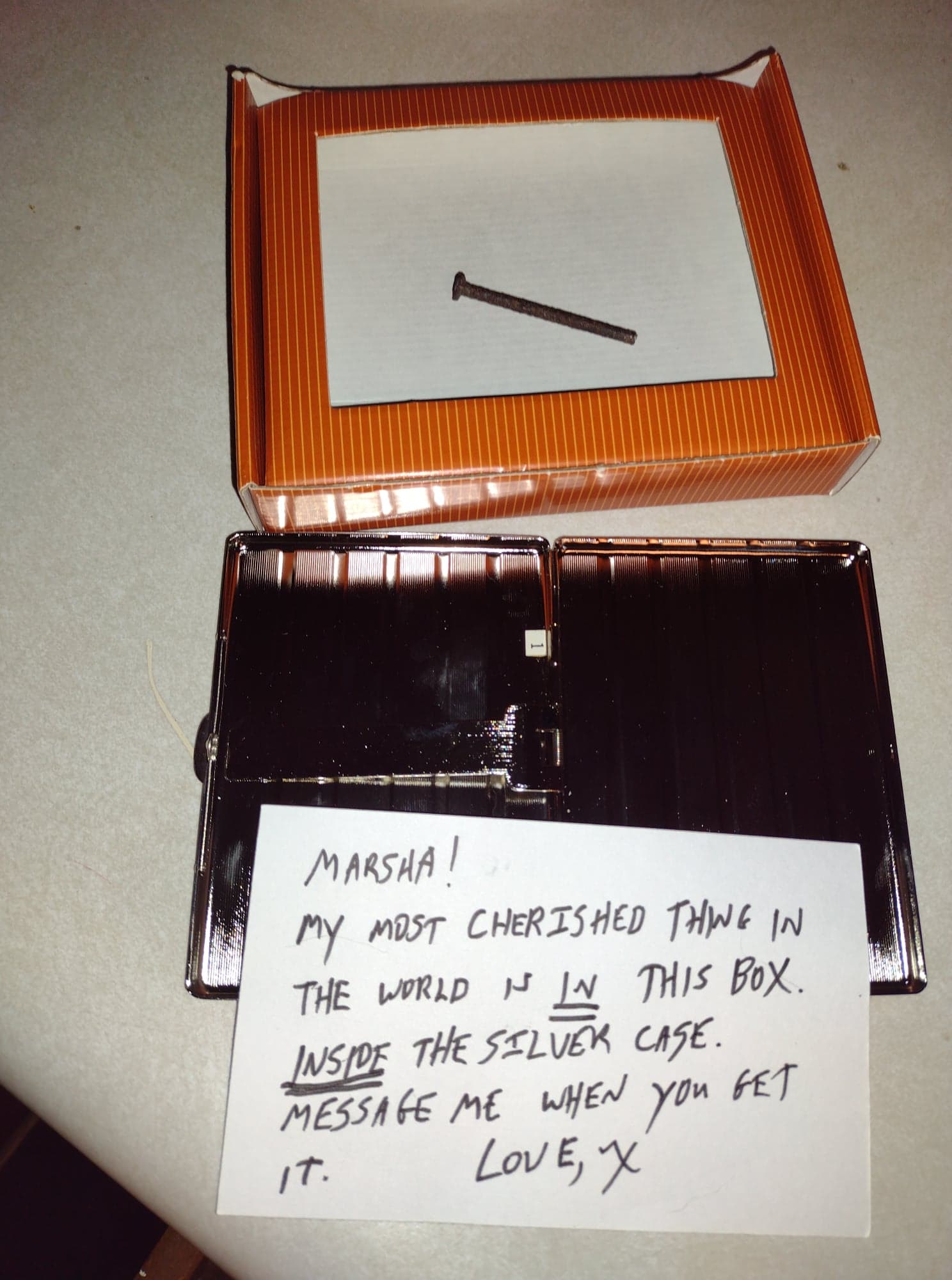 I have passed it along to someone who might appreciate the depth of my giving it away. I placed it inside a collectible silver cigarette case, one which was salvaged and saved from the wreckage and the remains of another life. A cigarette case in itself has meaning to the person who is receiving the nail.