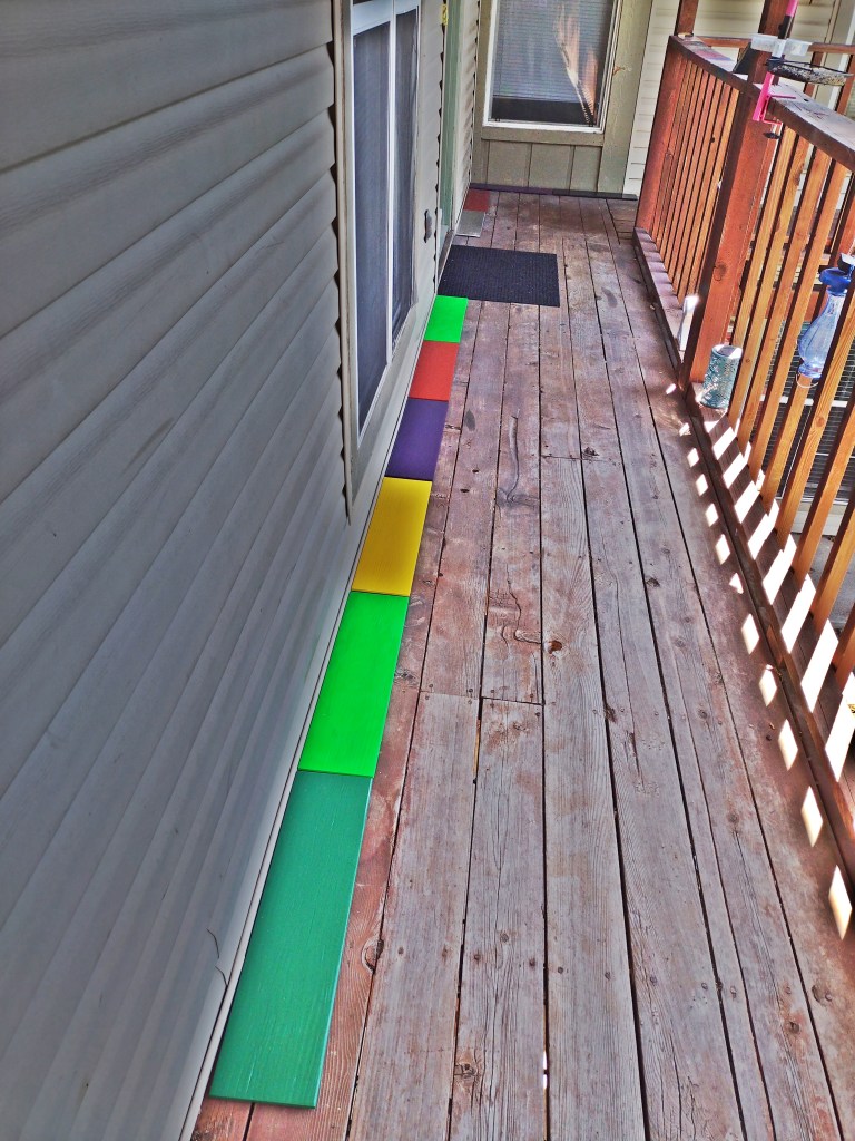 . The picture of the edge of my deck is my color tile project-in-the-making. Several of the neighbors probably think of me as some kind of artist because, most days, I’m on the deck painting a variety of things that look out of place. The apartment simplex has a variety of people: dealer, disabled, dog people, and probable serial killer. I have a lot to shoot for if I want to become the most infamous resident here. To be accused of too much color and art would be a glorious compliment.
