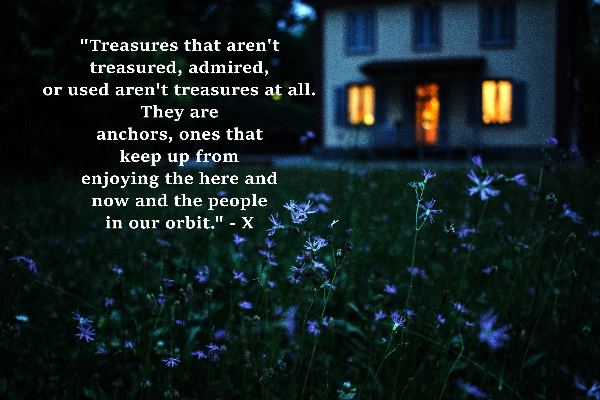 “Treasures that aren’t treasured, admired, or used aren’t treasures at all. They are anchors, ones that keep up from enjoying the here and now and the people in our orbit.” – X