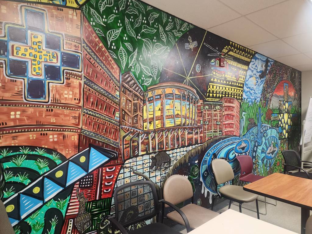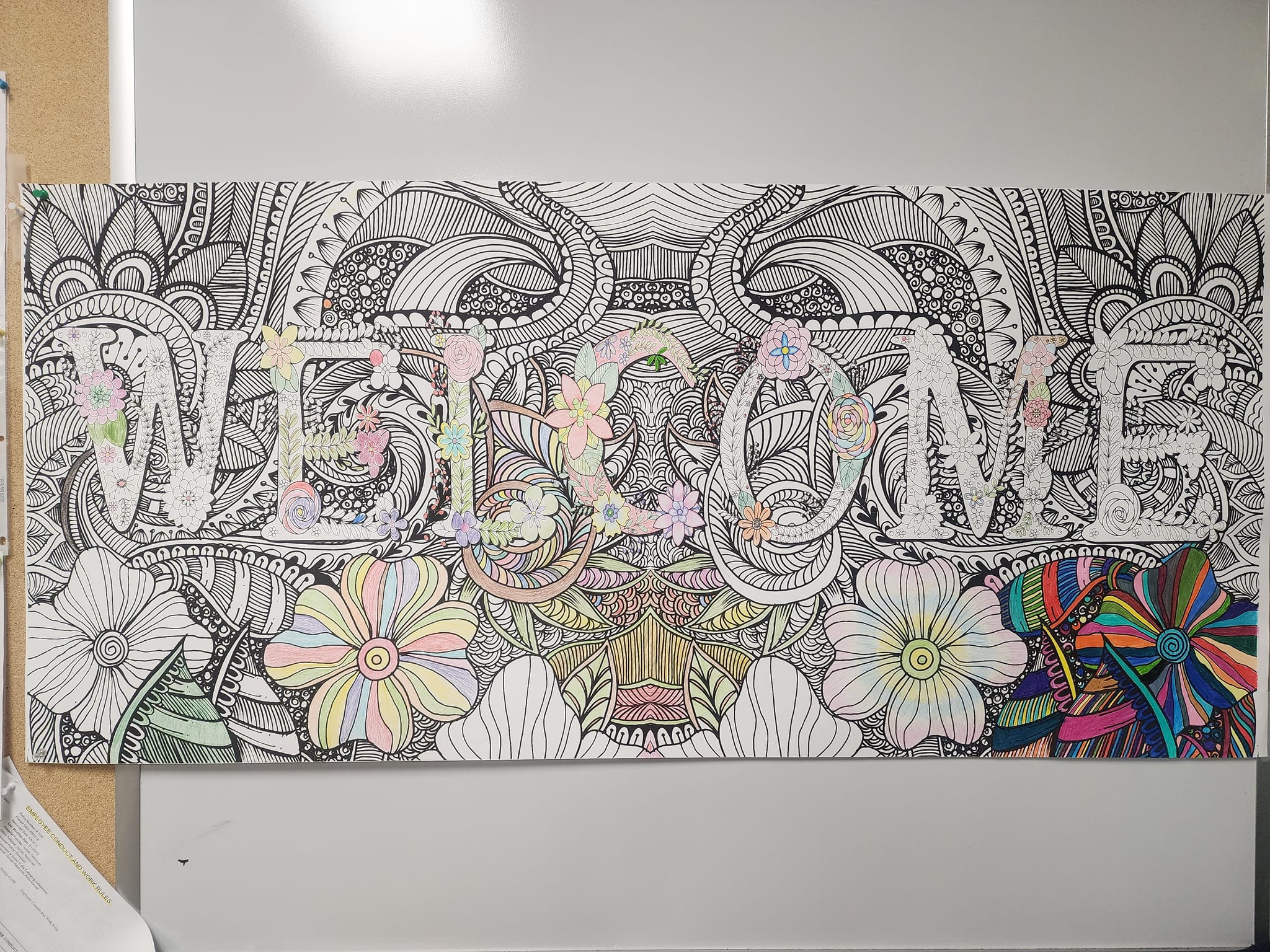 Both the mural and the art project are in the breakroom near where I work. I think they both are beautiful, both the completed mural and the work in progress of the colored pencil drawing. It’s a demonstration of art where art normally isn’t. And it’s also a demonstration that beauty and art can coexist anywhere, even in sterile places. What confounds me is that there are a few people that think such efforts are wasteful. Because anything that distracts us from our routine life, especially when it’s mundane, is worth the effort. All the important things are invisible. Though the mural and art project exist in space, it’s what they do inside of our heads as we look at them that makes them worthwhile. Creativity and beauty are among those. Love, X