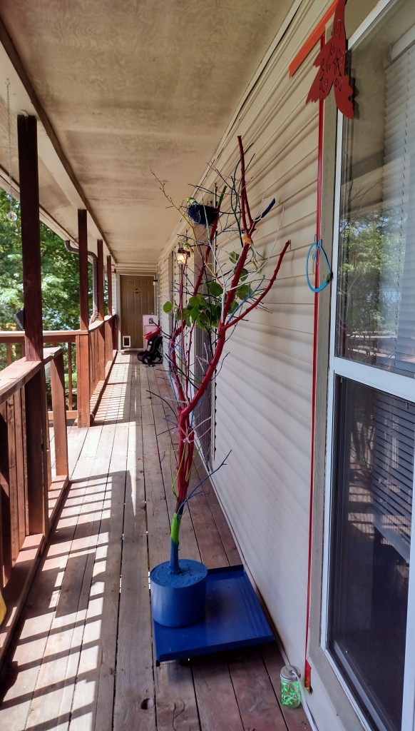 I decided to put my dead tree on the landing. The tree base is quickrete. I made a mobile platform with recycled metal and wheels. Today I had the joy of standing in the blazing sun and putting a clear finish on the colorfully painted limbs of the tree. Those aren’t real birds perched on the limbs and blue nest. At least, I don’t think so. Given the temperament of the squirrels around here, I fully expect to exit my apartment and find a squirrel’s nest on the tree at some point. .