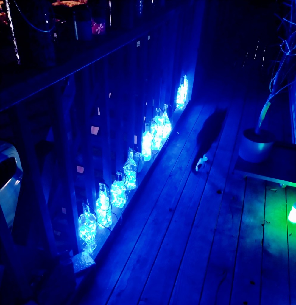 My cat prowling the early morning landing around 3 a.m. To the left you can see my new set of mismatched blue bottle lights. They are very vivid! I am afraid to leave them twinkling or flashing. My neighbors all tend to get nervous when they see blue flashing lights. No one would come out of their apartment for a week.