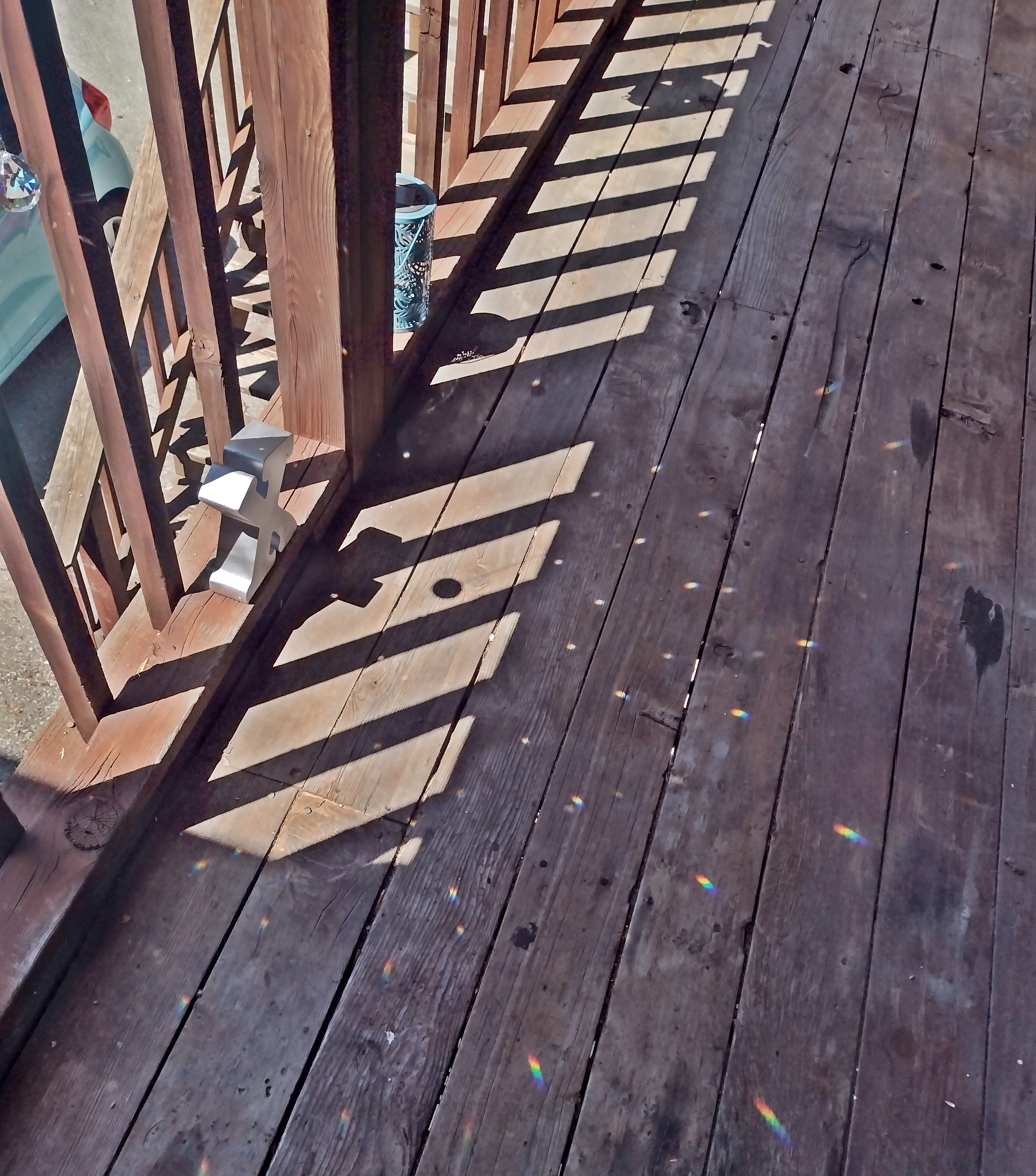 Sometime in the last few minutes, my prisms have washed the deck with several hundred little rainbow dots. The wall with the terrible light fixture is awash in them.