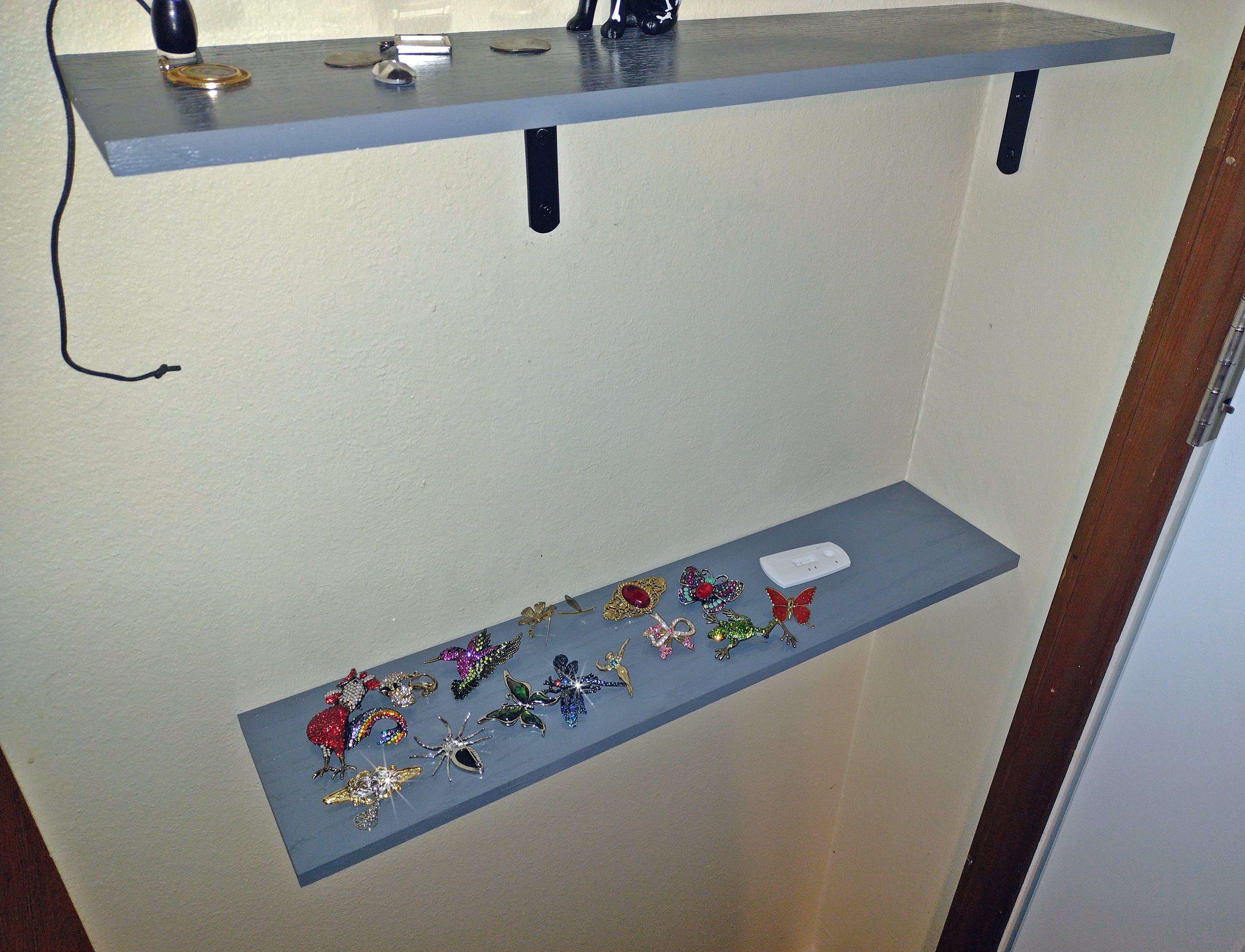 I’m using the bottom shelf to display my favorite brooches. I guess I have a brooch addiction. What kind of 12-step program is available for such an affliction probably would be really fabulous.