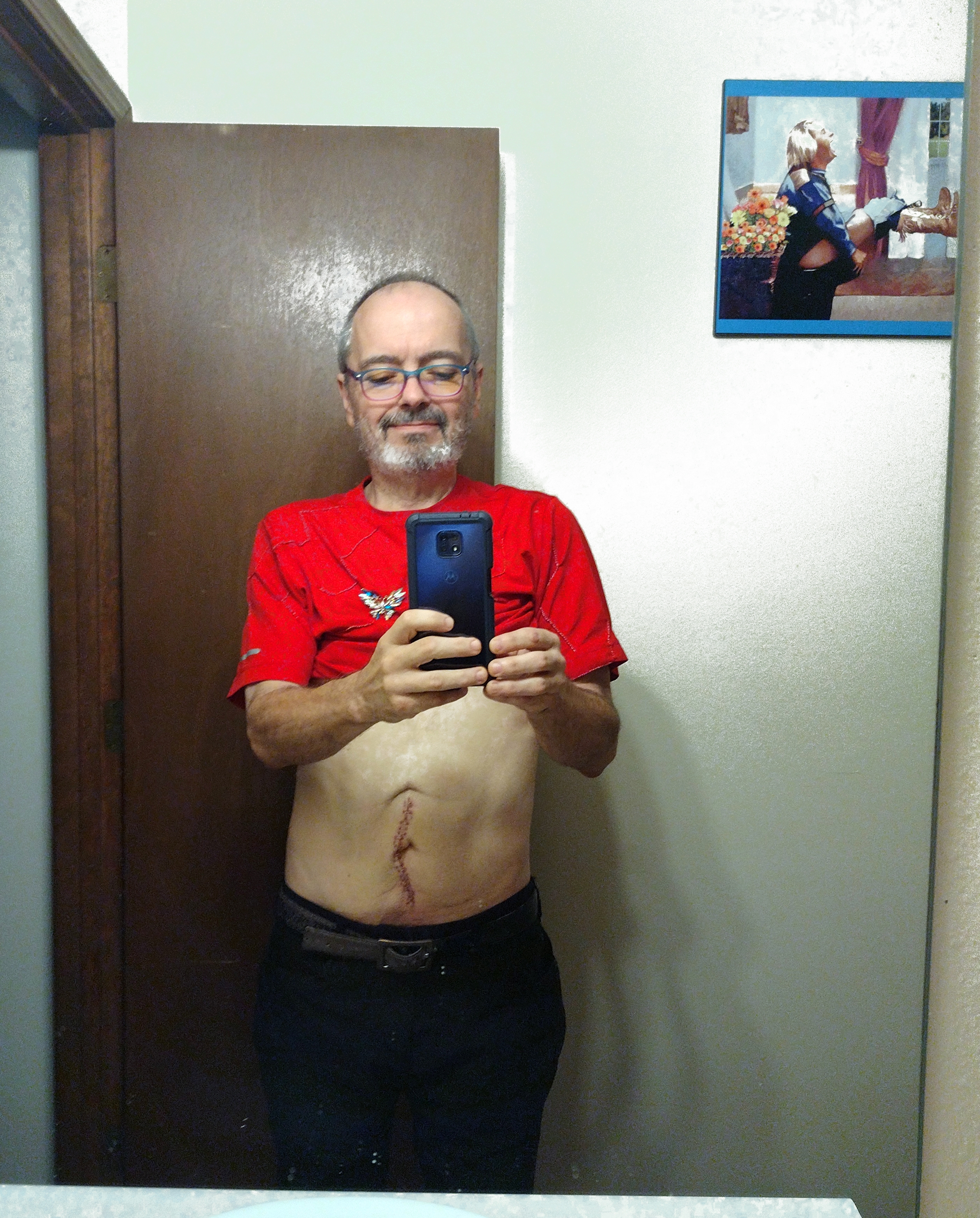 I parked at the Harp’s on Garland as I evaded the ongoing renovations to the store and parking lot. Getting out of the car and walking along the front of the building, I greeted one of the workers in Spanish. We traded comments and barbs. He pretended to hand me a shovel and said in Spanish, “If you want me to have a good day, you can have this.” I laughed as I pulled my shirt out of my waistband, revealing my exposed scar. “¡Me ganaste!” he said, even as he laughed. Yes, I did win that round.