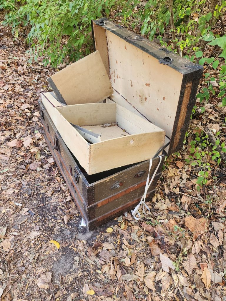 To the right of the path, I saw what initially looked to be a barrel. As I neared it, I realized it was an antique trunk. The lid was carelessly thrown open and a couple of drawers sat haphazardly on top of the trunk’s opening.