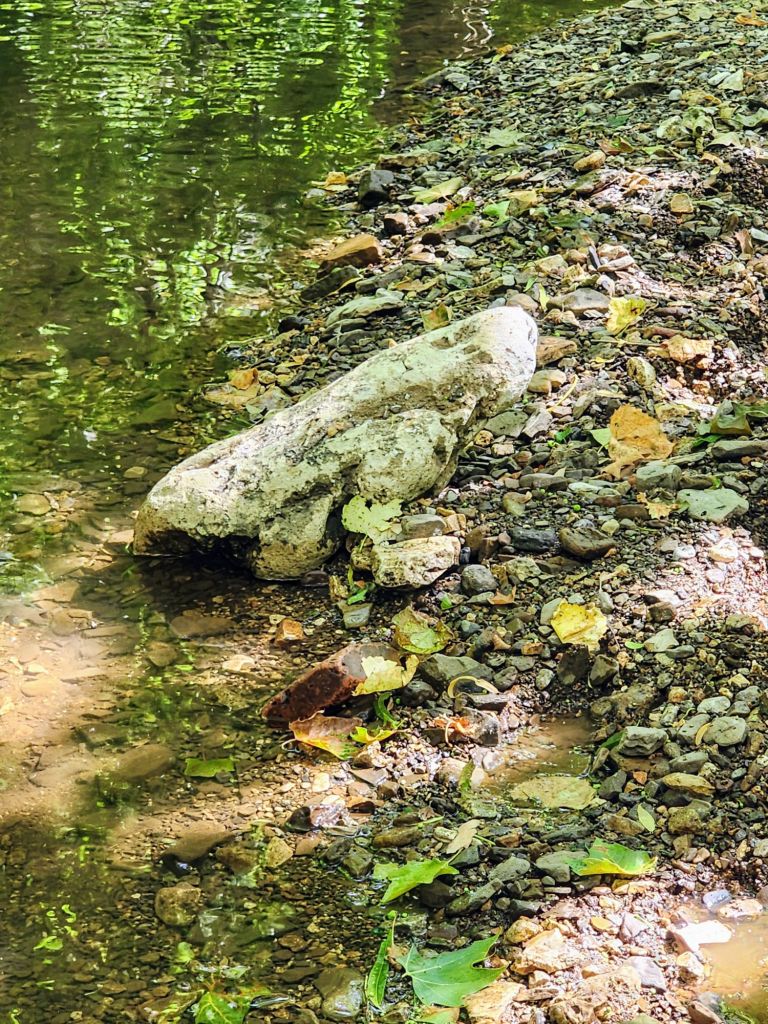 It doesn’t resemble much seen up close. But under the darker sombrous canopy of trees above the creek, shimmering with sunlight shadows, it looked alien and transplanted. I wish I had brought my markers and chalk to further adorn it and give it a bit of life through color.