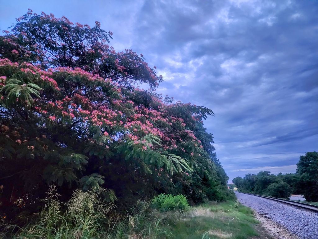 Because of the unique view my apartment grants me, I’ve noticed there are certain moments before sunrise when there are fleeting moments of beauty. This mimosa stands guard across the street, adjacent to the railroad tracks. Because of the beautiful trail enhancements and the modern lighting that adorns it, there are a handful of minutes when the mimosa seems to be backlit. The brooding clouds seen to enhance it. I took this picture twenty-two minutes before sunrise.