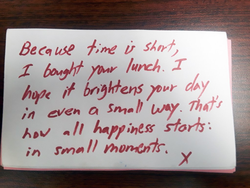 I paid for all three meals, tip included, and walked back to their table, placing one of my infamous index cards at the end of their table. “I included tip, too,” I said. I pirouetted quickly and marched quickly away from there before a torrent of thank-yous could envelop me. Near the front door sat a table full of construction workers. They looked up at me as I marched. The women behind me were excitedly commenting. I’m assuming the difference in pitch and enthusiasm, combined with me blazing across the floor after a dramatic pirouette confused the construction workers. I half-expected one of them to jump and prevent me from exiting. I laughed loudly and unexpectedly as I walked outside.