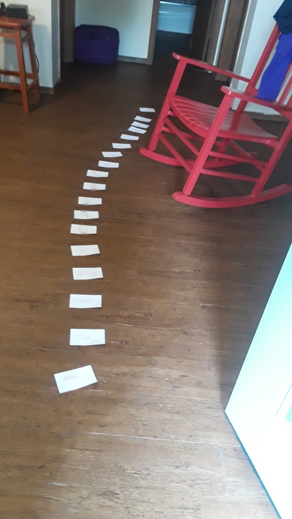 And those index cards on the floor leading the rocking chair were part of an elaborate ruse that I couldn’t execute today. I have optimism for tomorrow. You’ll note the rocking chair is in front of an open door, leading to a balcony and a whole new world.