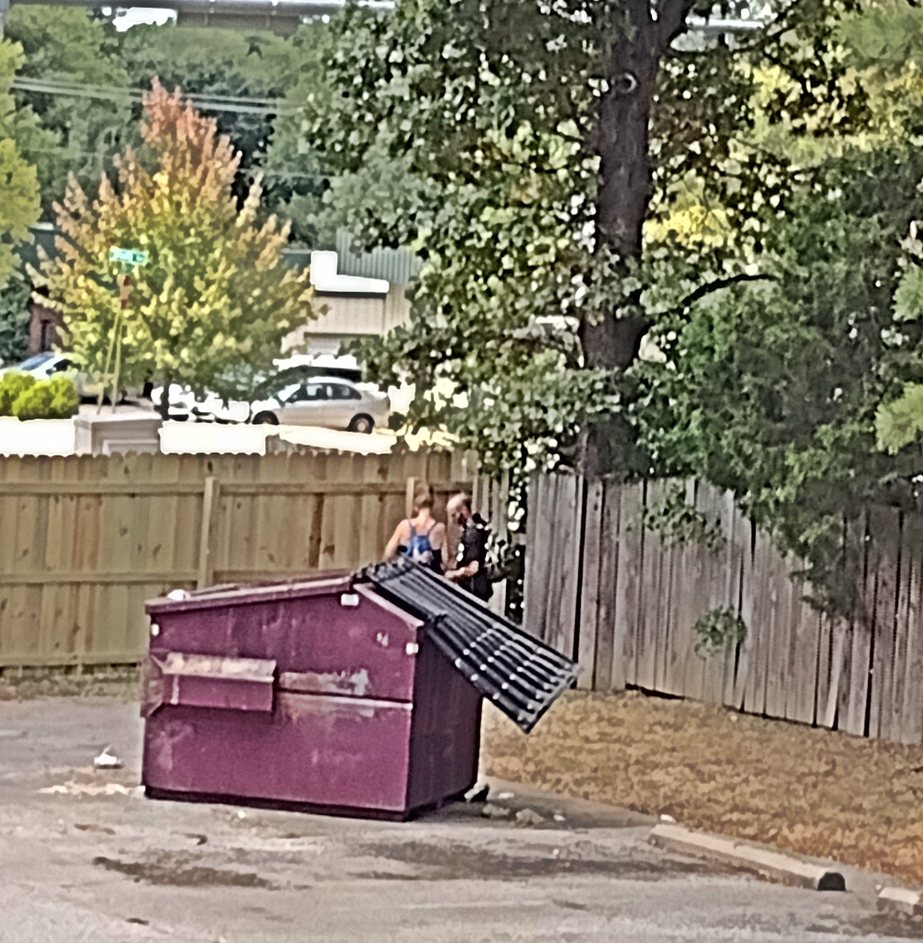 As life does, a story walked up, disguised as a man and woman. They went to the dumpster in the front. Both had backpacks. The woman fearlessly climbed up and inside. The man stood to the side.