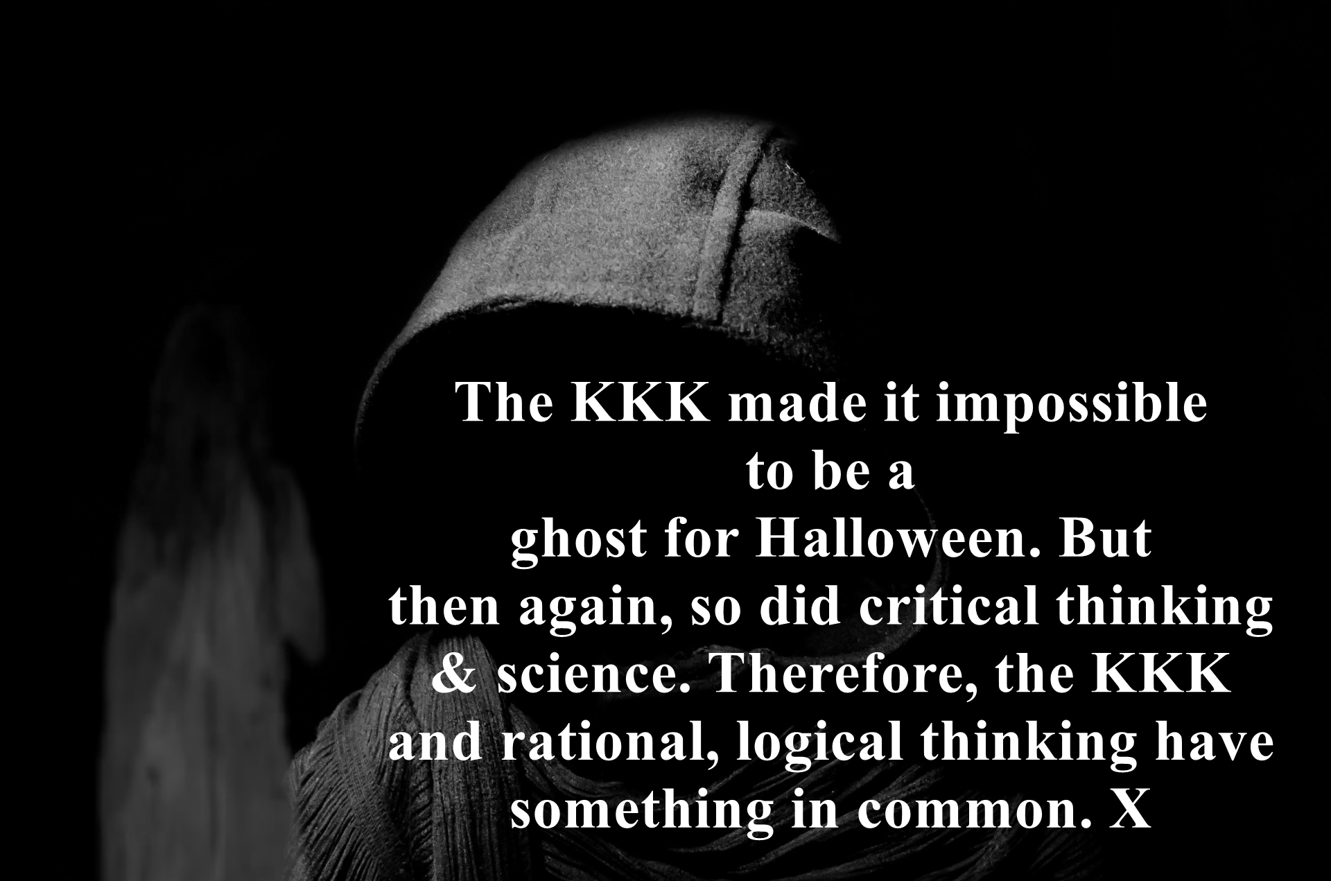 First, white sheets are ridiculous. Not only do they stain, but due to their interpretation when worn, in some parts of the country, it might get you into trouble. Ghosts know this. I wonder how many people involuntarily BECAME ghosts due to being a member of one of those ridiculous organizations?