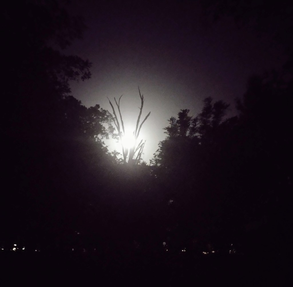 The other picture is of the moon at 3 a.m., peeping through the silhouette of a dead tree amidst living trees.