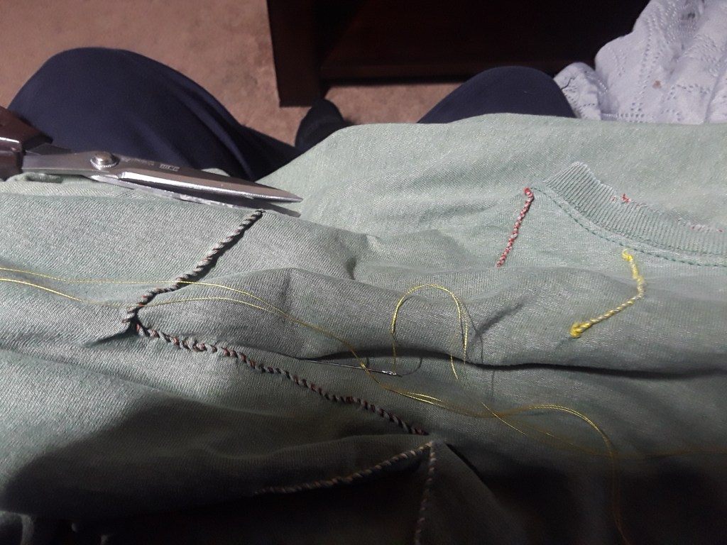 When I was 30, I made a shirt for someone I initially thought was mocking me. He pulled me aside to correct me and told me that the idea was perfection to him. Because he was a large black man, I chose a very large shirt. I monogrammed his nickname along one sleeve and put hundreds of stitch lines on it. It was the only time that I worked hard to get the stitches perfectly aligned. When I handed him the shirt, he teared up. “Wow. I bet this took twenty hours to make, X!” I shook my head. “No, it took fifty.” He couldn’t believe that I spent so much time making him the shirt. He died much too young a few years later. What breaks my heart when I think too long about it? I told him I could teach him to do basic stitching in less than 15 minutes. So it came to pass that I sat in an industrial office in a vast poultry plant patiently showing another grown man how to stitch. It occurred to me how strange the idea would have been to my Grandma.