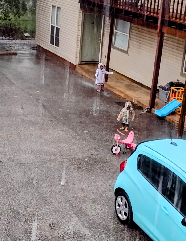 What a delight it is to watch two small children scampering in this heavy rain. They are squealing with happiness. But I’m also confused because they’re wearing raincoats! .