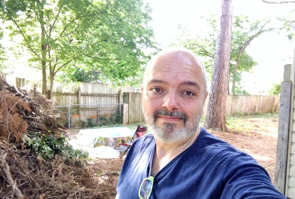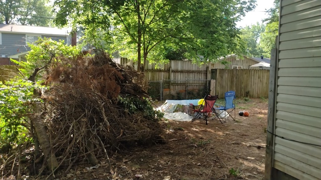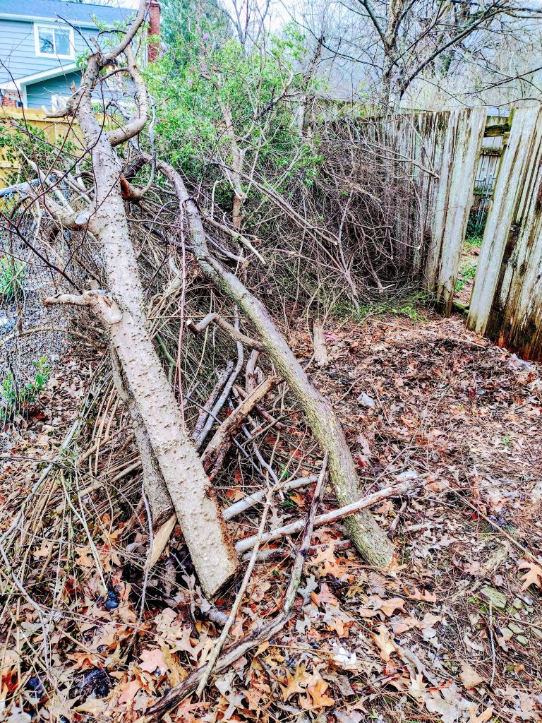 I worked in the back this morning too, clearing out a huge section of fence and limbs. A truck can drive around now, whether it’s an electric service vehicle or ice cream truck is up to the universe. So far, the landlords have not removed any of the tons of limbs and fences I’ve piled back there. A bonfire seems to be more and more likely, especially if one of the neighbors who smoke tosses a butt in there one summer evening. I cleared out some more of the contents of what I refer to as the Drug Shed. That thing is definitely coming down at some point. I banged on it before going inside. Copperheads love the back corner of that thing. I’m not needlessly scared of snakes. (I work with middle managers every day.) I’d prefer to avoid snakebites, though, both at work and back in the Drug Shed. There are black snakes back there too, ones that probably miss the jungle-like atmosphere that existed prior to me turning my attention to clearing it.