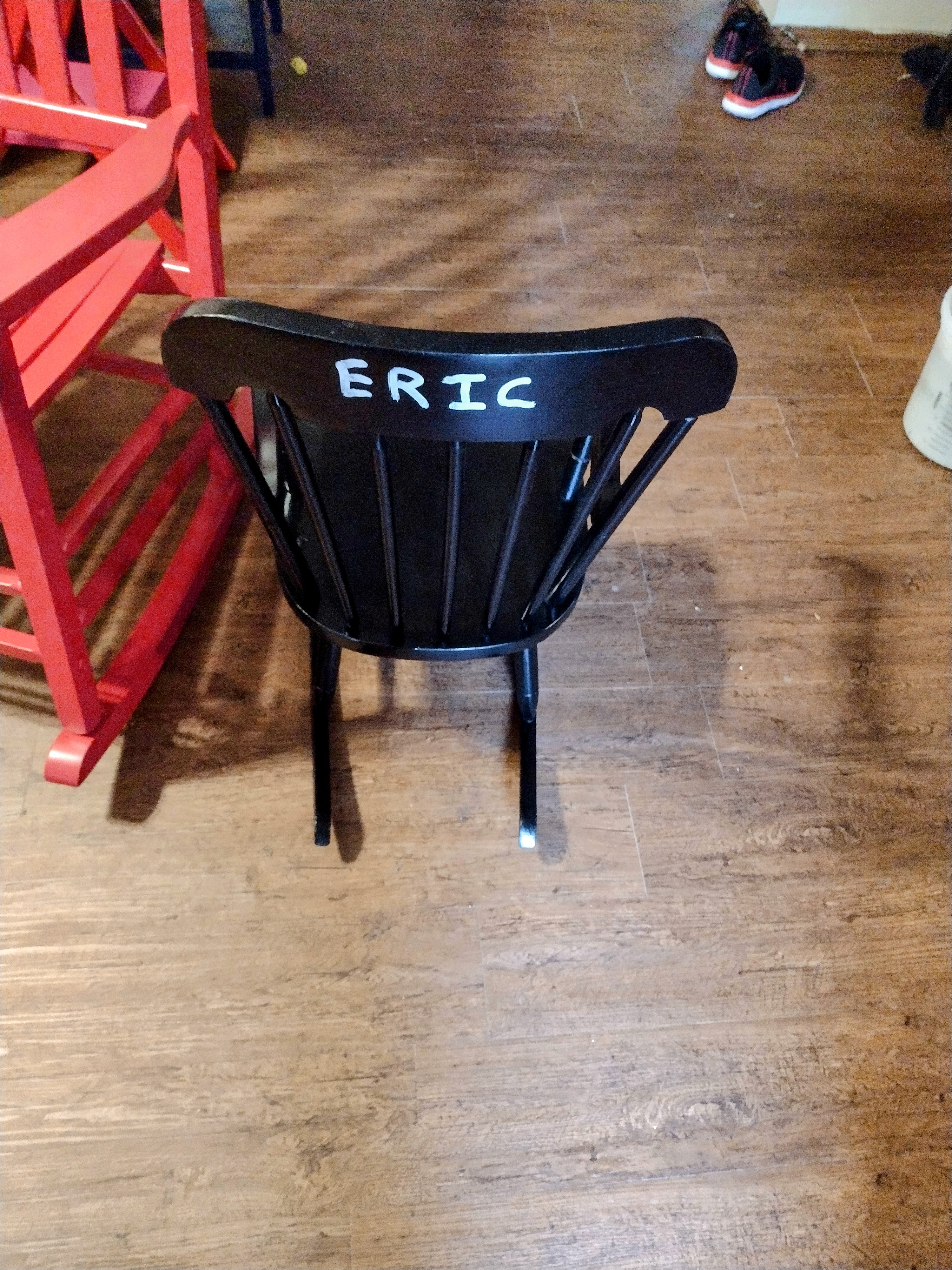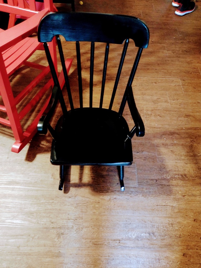 I finished the child’s rocking chair project. It was a very old one that had been in use for a long time. I put new screws in it and shaved down some of the dowels, glued them, and then sanded until I was sick of it. Instead of crazy color, I used lacquer black. Because I decided to give it to a neighbor’s little boy, I painted his name on the back. I surprised the dad with it this morning. I love the idea that it’s an old chair, sat on by hundreds of children. Then discarded and rescued. Everyone needs a rocking chair. (Except maybe for those with hemorrhoids and skittish cats. Probably includes people with cats with hemorrhoids, too.)