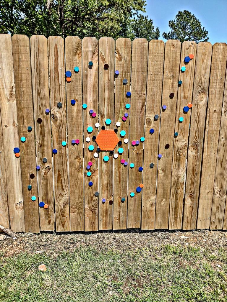 On the new section of the fence facing Gregg, I painted a series of sizes and colors of hexagon tiles and made a spiral pattern with them. The picture is not great because it is hotter than a demon’s right buttcheek out there and the sun blinded me as I snapped a photo. I made a pattern to make each spiral exact. After starting, I did what I usually do and decided that I like asymmetrical much better and opted to wing it and let them harden regardless of spacing and orientation. Having finished it, I would like to say it didn’t take much time to do. It did, however. Now the passersby have another design to stare at as they whiz by on their way to whatever and wherever.