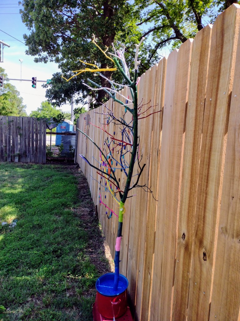 I decided to put my dead tree on the landing. The tree base is quickrete. I made a mobile platform with recycled metal and wheels. Today I had the joy of standing in the blazing sun and putting a clear finish on the colorfully painted limbs of the tree. Those aren’t real birds perched on the limbs and blue nest. At least, I don’t think so. Given the temperament of the squirrels around here, I fully expect to exit my apartment and find a squirrel’s nest on the tree at some point. .