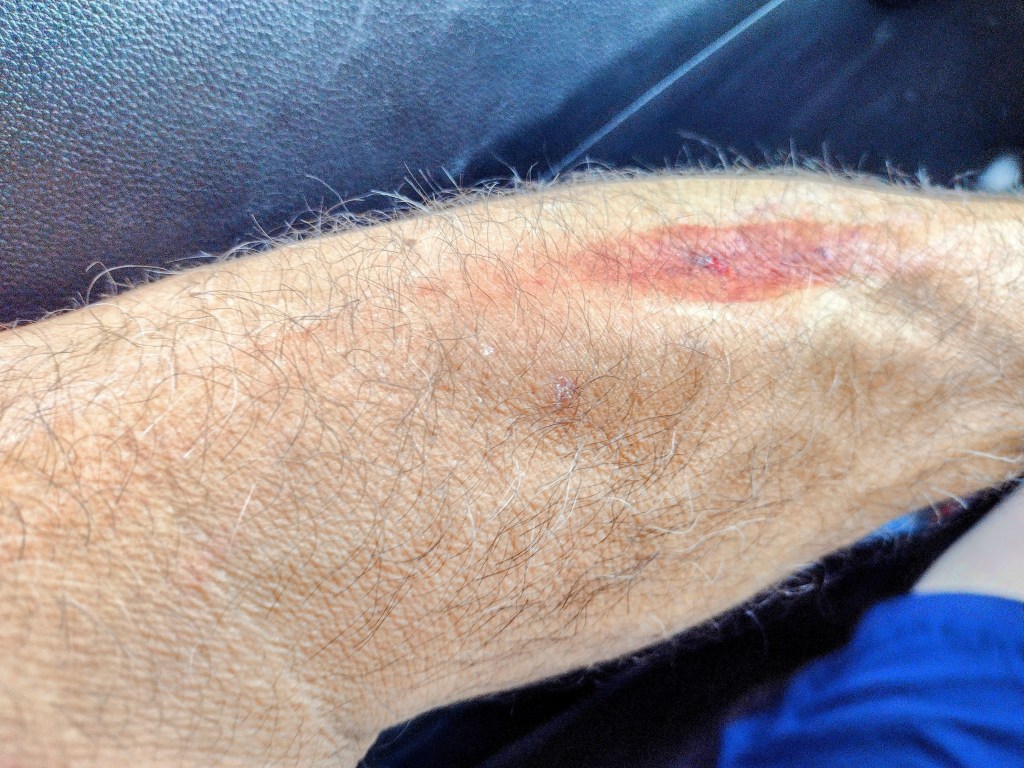 No pain no gain is a terrible cliché. I was cutting a limb high above my head. It must have been dead inside because it snapped unexpectedly and flipped. Because I had darn near put an eye out the other morning at work, my reflexes kicked in to protect my head. Which is foolish because I obviously don’t use it well. I had two major head traumas when I was a kid. Those couldn’t have been too bad because I still vote liberal. That’s supposed to be funny, all you politicos out there! I will be on the lookout for manholes without covers – and Baptist preachers… Sorry, that’s another joke. Please don’t tell me to be careful, because stupid people don’t heed that advice and cautious people don’t need it. I think it’s pretty obvious which camp I’m affiliated with.
