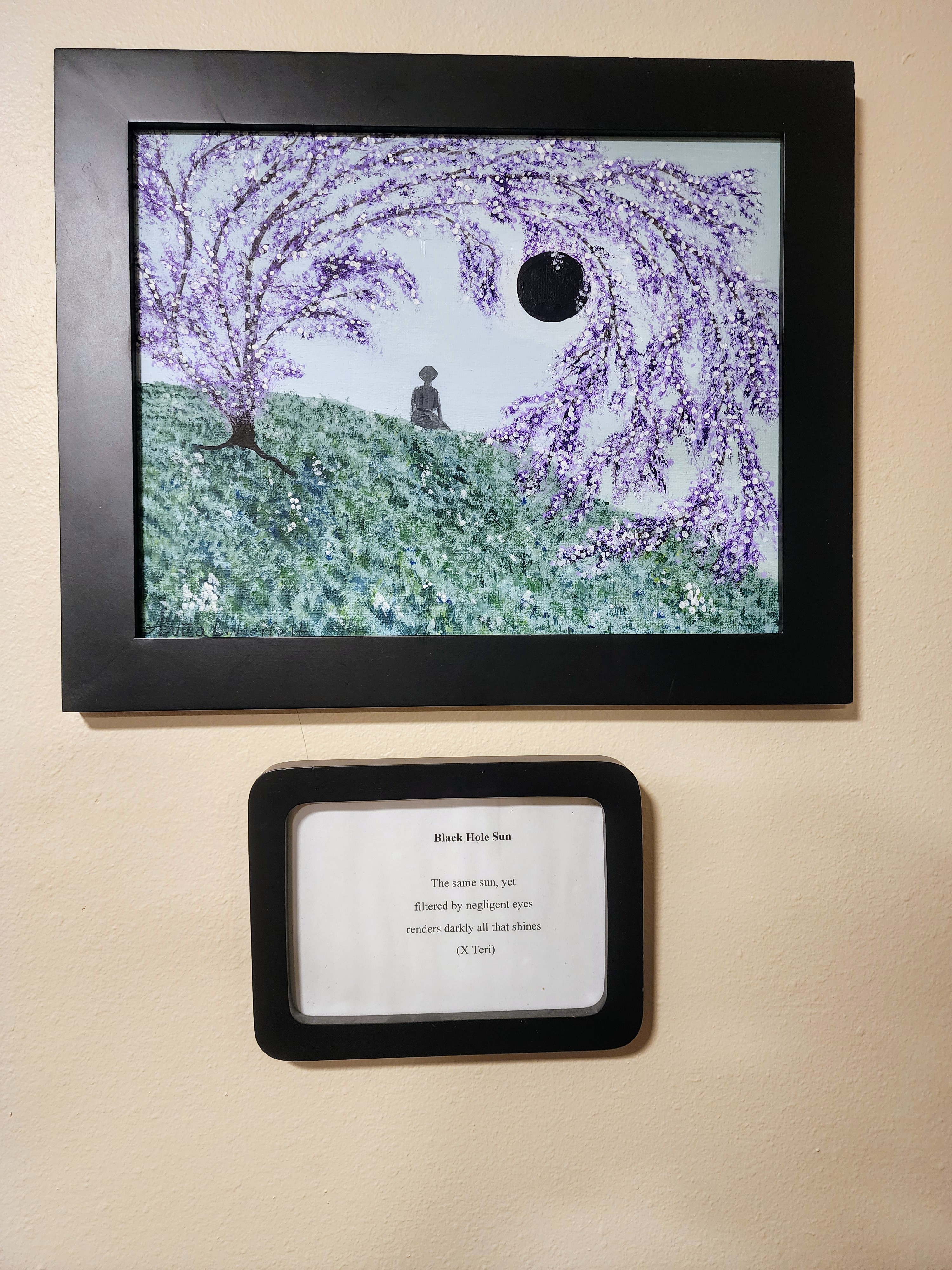 Below the art is a framed caption I wrote: “Black Hole Sun: The same sun, yet filtered by negligent eyes renders darkly all that shines.”