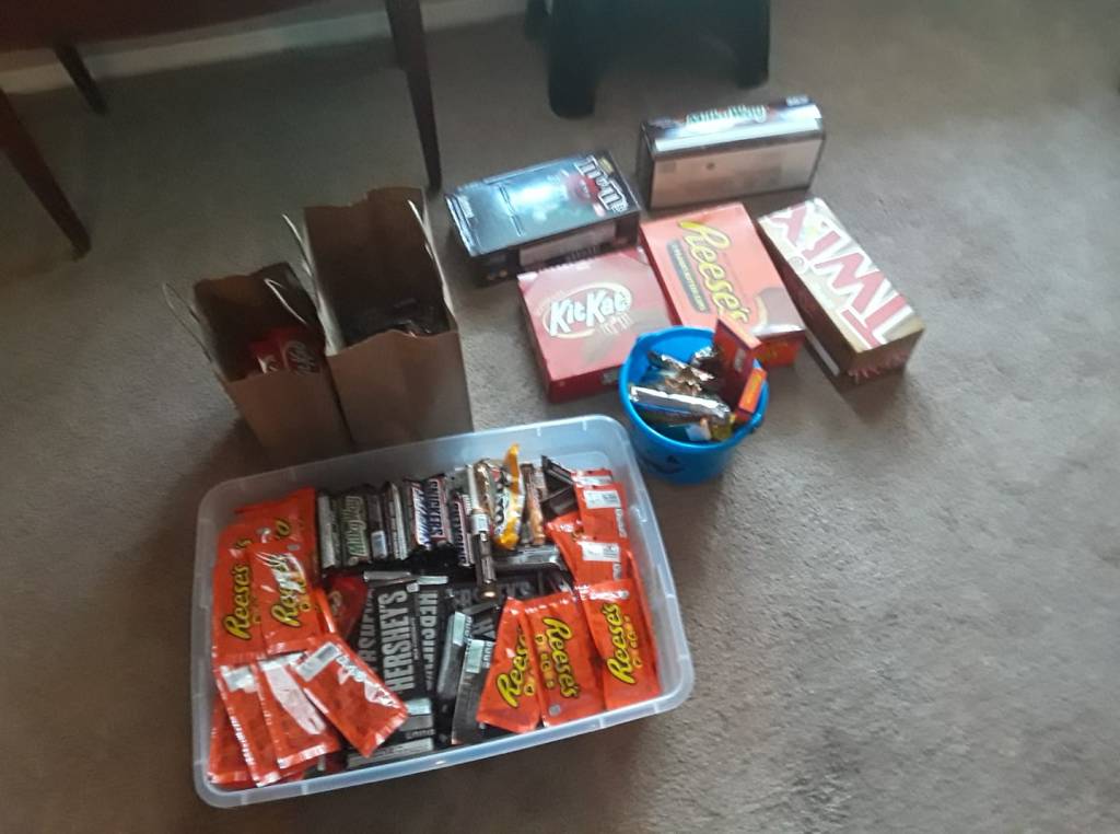 Several hundred full-size candy bars doesn’t look like much now. Will there be little ghouls to rescue us from this hoard? *