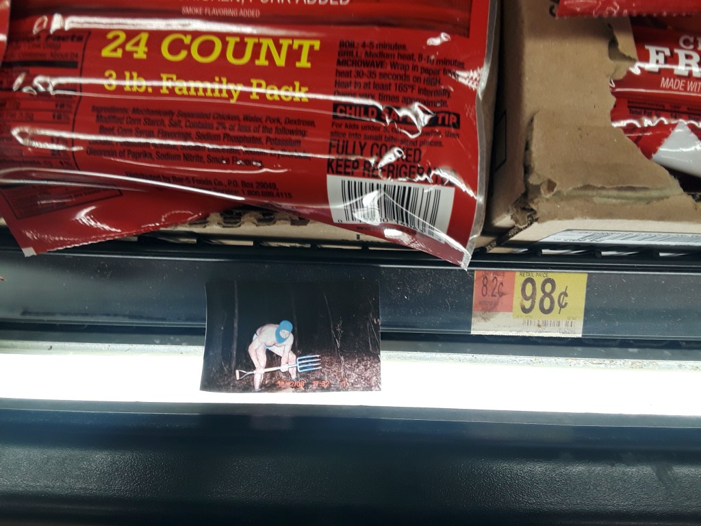 In the way that so often happens to all of us, I had leftover Pitchfork Creeper pictures from my last birthday wrapping gift surprise. Because it’s been too long since I’ve done so, I took my extras with me to the grocery store and strategically placed them around the store.As always, I find myself laughing and wondering what people think as they encounter them in their mundane shopping experiences.*