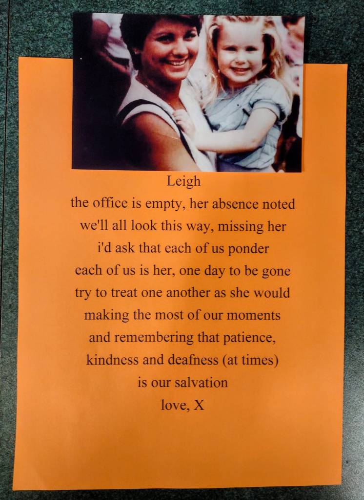 As much as Leigh looks forward to retirement, I know she mourns the loss of people who’ve occupied her waking hours for so many years. I miss her already. I try to imagine what was in her heart as she looked around at us laughing and sharing stories.
